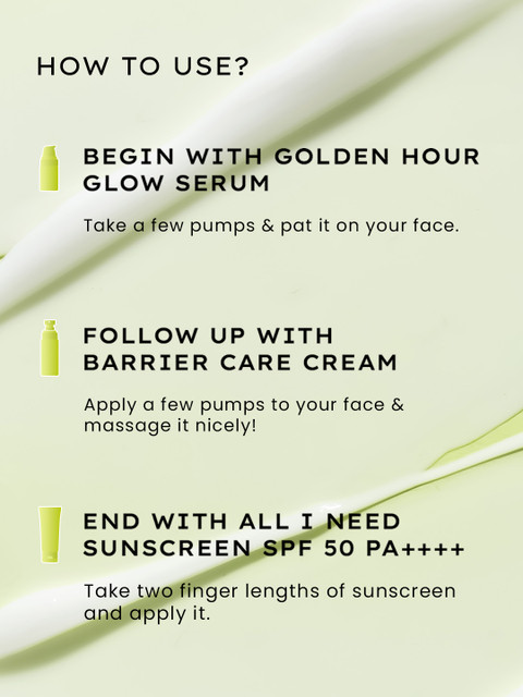 | How-to-Apply | Serum: Take 1-2 pumps and pat on your face &, neck, until absorbedBarrier Cream:Take a few pumps and massage it well on your faceSunscreen:Take two finger lengths of sunscreen and apply it to your face, and other sun-exposed areas of your skin |