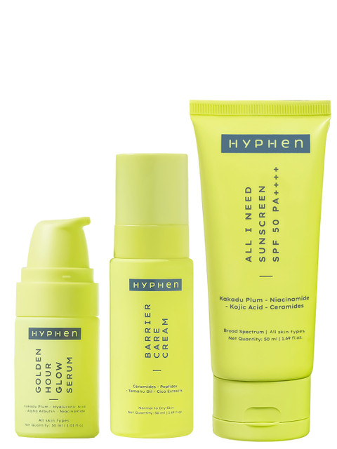 | Ingredients | Golden Hour Glow Serum: Kakadu Plum, Hyaluronic Acid, Alpha Arbutin, Niacinamide, Peptides, Aloe Vera extract, Lactic acidBarrier Care Cream: Ceramide, Peptide, Tamanu oil, Cica extract, Chia seed oil, Aloe Vera extractAll I Need Sunscreen: Kakadu plum extract, Kojic Acid, Ceramides, Vitamin E |