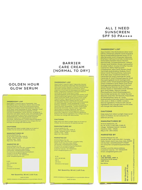 | Special Features | Non comedogenicVeganZero plastic footprintAlcohol freeParaben freeSLS freeCruelty freeGolden Hour Glow Serum:Brightens Skin, Deeply Hydrates,Antioxidant Rich,Even Toning, Soothing, Nourishing, Smoothening, SofteningBarrier Care Cream (Normal to Dry Skin):Repairs &, strengthens skin barrier,Deeply Moisturizes,Hydrates, SofteningAll I Need Sunscreen:UVA &, UVB Sun Protection, Moisturizes,Antioxidant Rich,Hydrates, Softening |